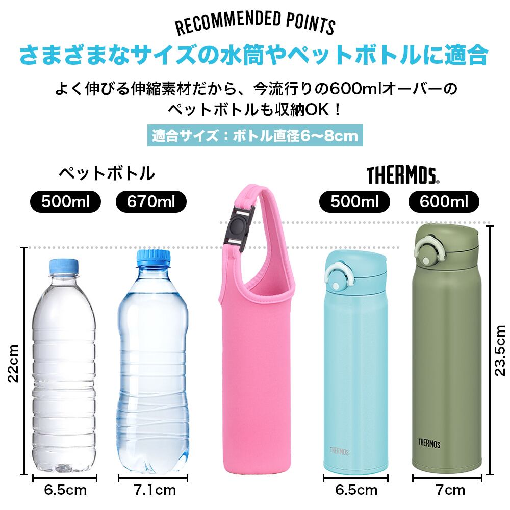 よく伸びる伸縮素材だから、サーモスボトルはもちろん、今流行りの600mlオーバーのペットボトルも収納OK